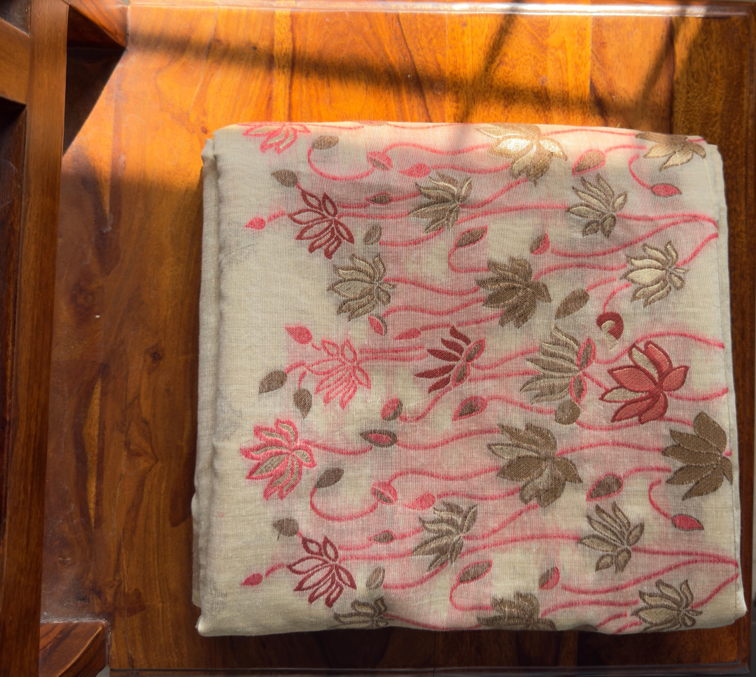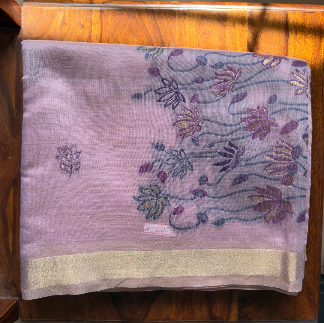 Description: Graceful Muga Cotton Saree featuring soft pastel tones adorned with beautifully woven lotus motifs in pink, green, and earthy shades. The intricate thread embroidery flows across the body, giving the saree a refined and timeless appeal. Finished with a subtle gold-tissue border, this lightweight drape is perfect for everyday elegance, office wear, and small gatherings.