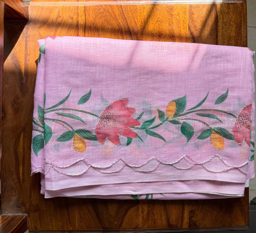 Description: Elegant Linen Semi Saree featuring soft pastel shades with beautifully hand-paint–style digital floral prints in pink, green, and mustard tones. The saree comes with a delicately scalloped embroidered border that adds a graceful, feminine touch. Lightweight, airy, and perfect for everyday elegance, small gatherings, or summer occasions.