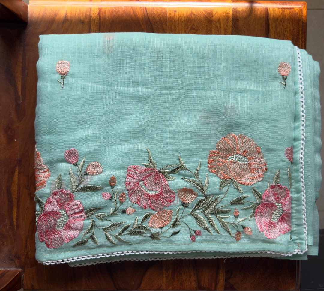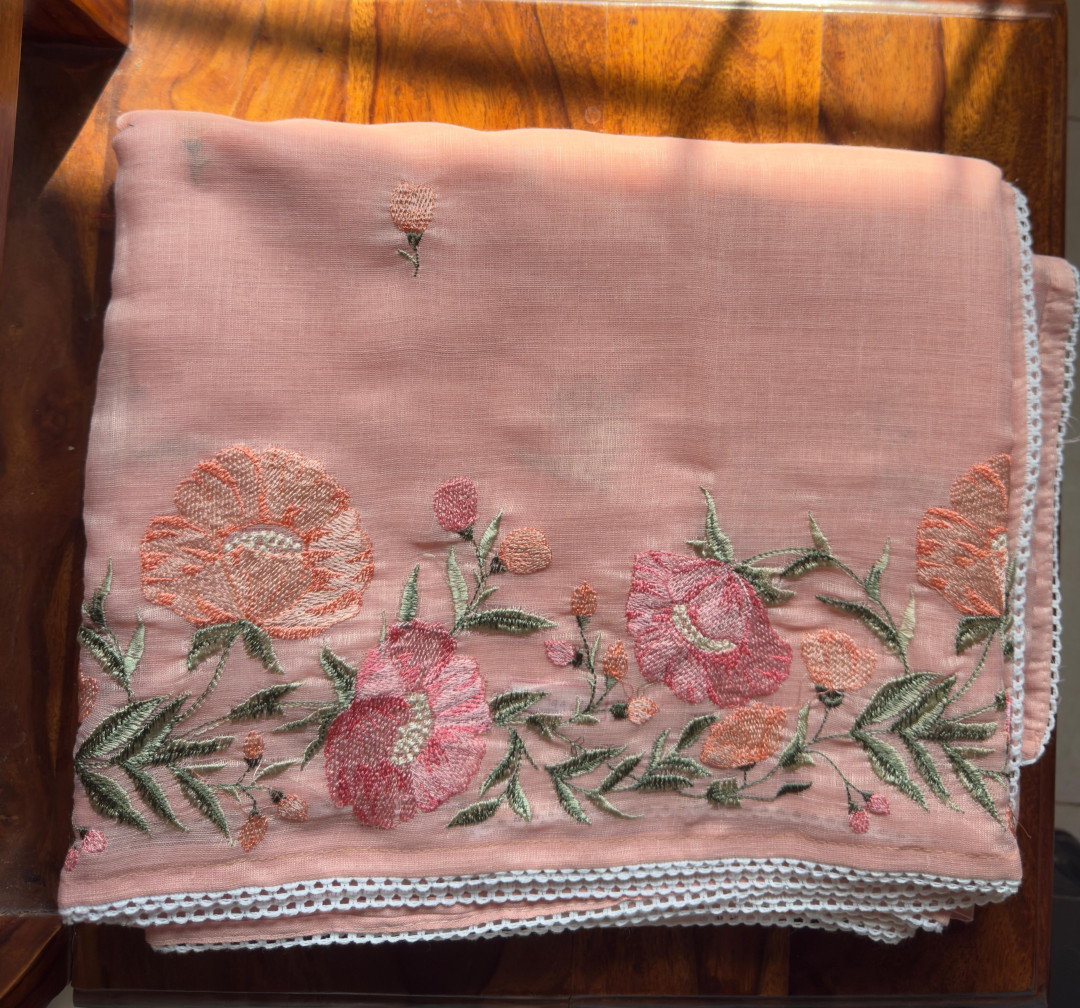 Description: Charming Linen Saree crafted in soothing pastel shades, beautifully adorned with detailed thread embroidery of blooming florals across the border. The delicate lace edging adds a soft feminine touch, enhancing the saree’s graceful appeal. Lightweight, breathable, and effortlessly elegant, this drape is perfect for daytime occasions, brunches, office wear, and intimate gatherings.
