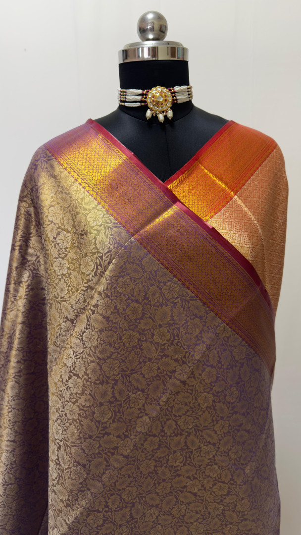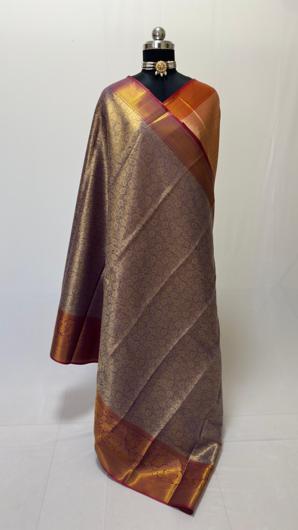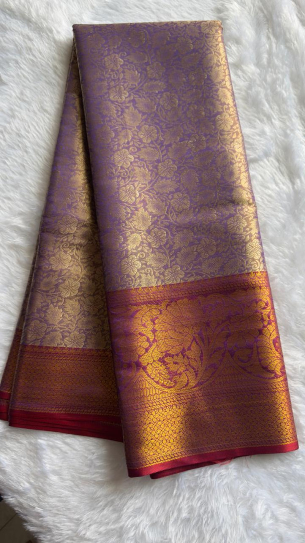 Charming lavender Semi Tissue Silk Saree highlighted with golden floral zari buttas and a vibrant orange-maroon border with intricate weaving. Graceful and festive.