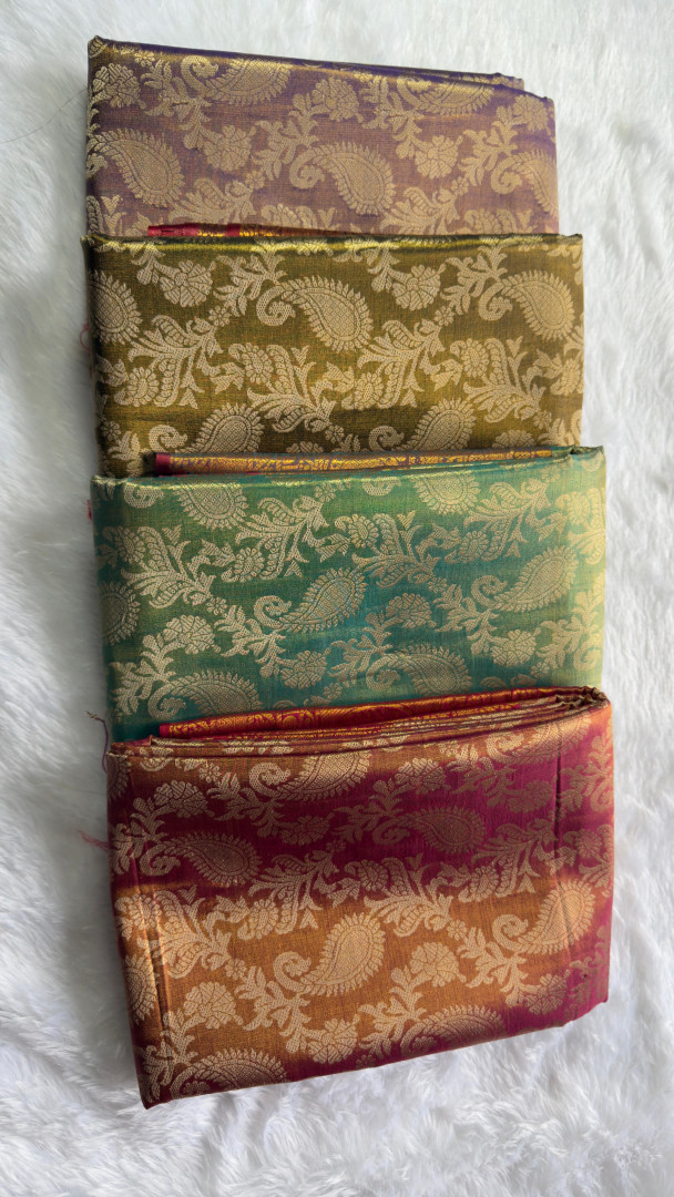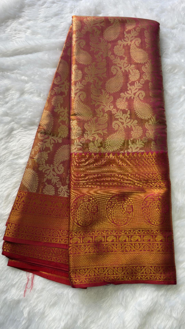 Exquisite wine-red Semi Tissue Silk Saree decorated with golden paisley motifs and a luxurious golden border featuring paisley and floral designs. Regal and festive in every drape.